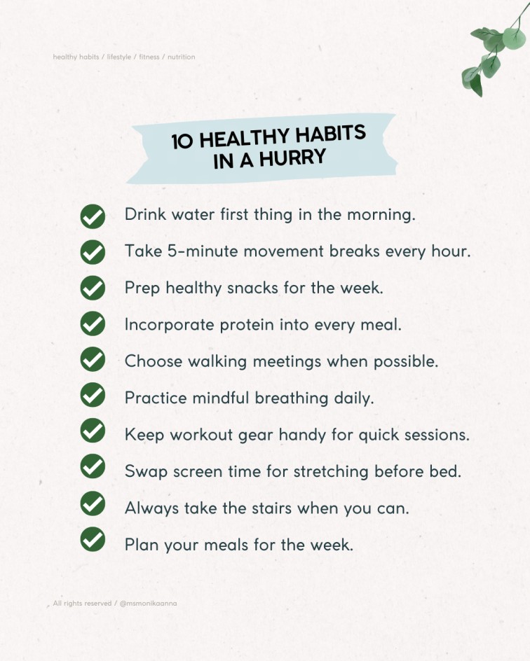 Small, consistent changes can add up to significant results over time. Here are ten quick and actionable habits you can incorporate into your busy schedule today.